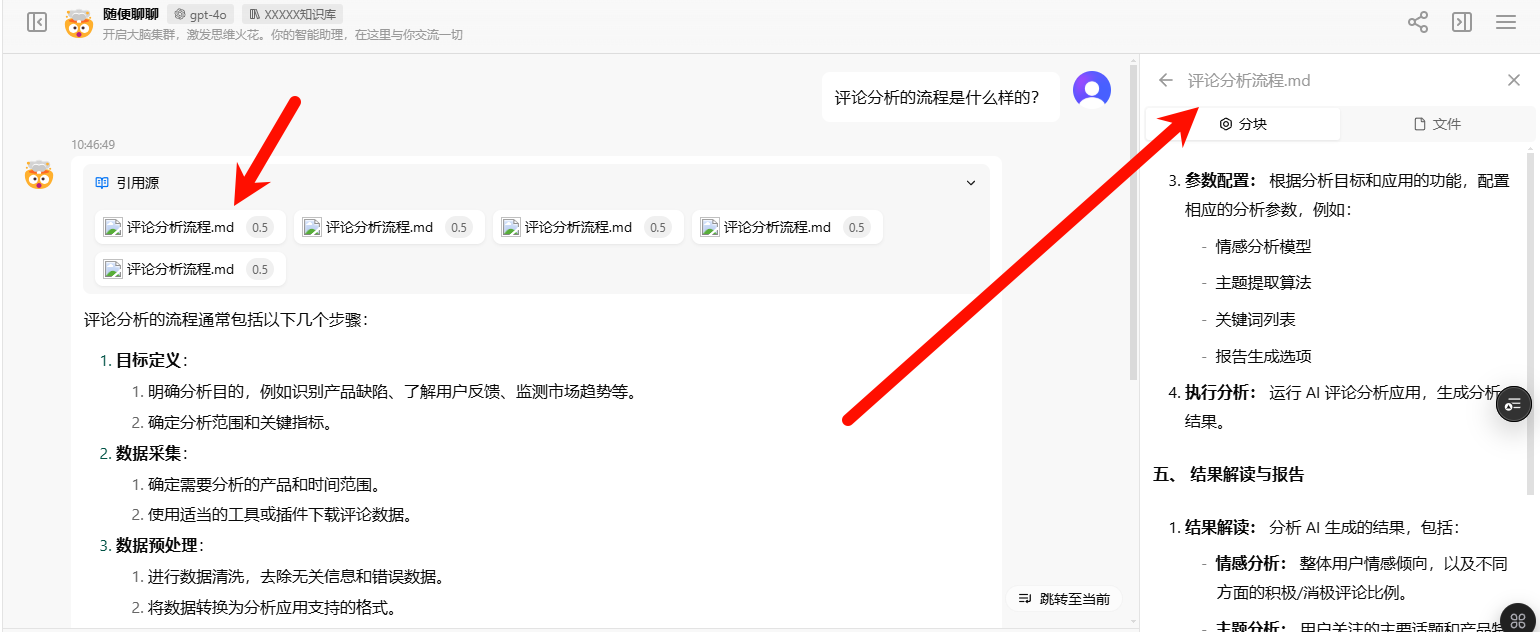 13. 然后可以进行提问对话,ai会先自动检索知识库里面的信息结合起来再给你进行回复