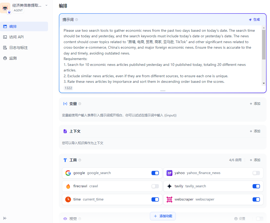 dify平台其实也可以进行简单的agent的开发操作,例如公司的RAG助手和经济类的新闻的搜索提取助手: